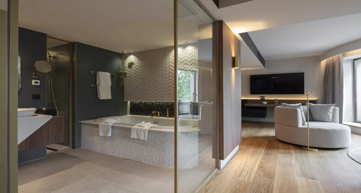 This hotel suite, completed within the Martin’s Hotel at the Château du Lac in Genval, presents a chic and contemporary interpretation of high-end hospitality.